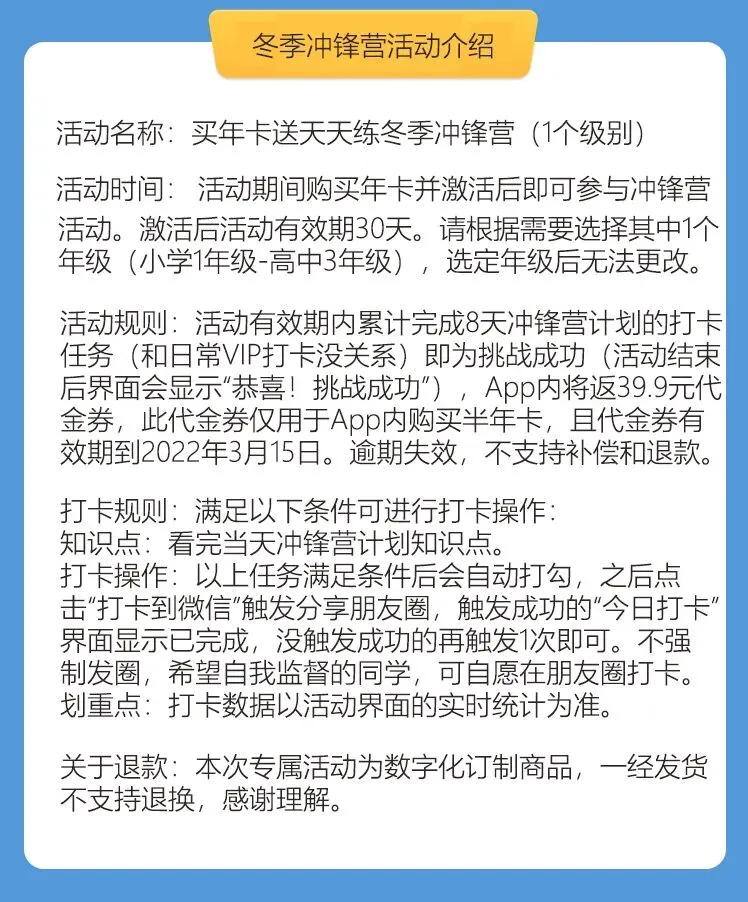 天天练这几天在做打卡一年返一年的活动,买年卡还会送一期冬季冲锋营,团购截止28号,激活时间截止29号晚23:59分,买完记得尽快激活。