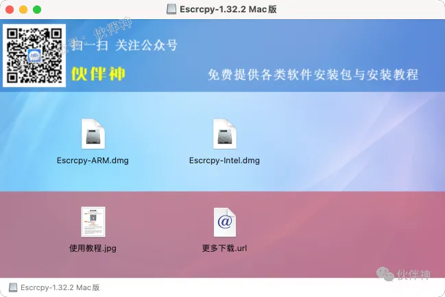 附:Mac版下载后,选择自己适配的版本安装Intel或ARM(M系列),打开dmg安装包,将Escrcpy程序拖入到【Applications】文件夹,自动完成安装。