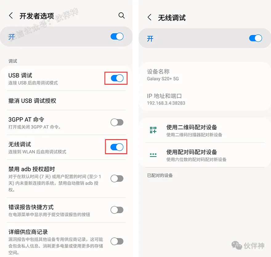 2.开启手机开发者选项(可根据自己手机品牌查询相关打开方法),开启后打开【USB调试】与【无线调试】,注意无线调试只支持安卓11以上系统,老手机只开启USB调试即可,通过数据线连接电脑使用。