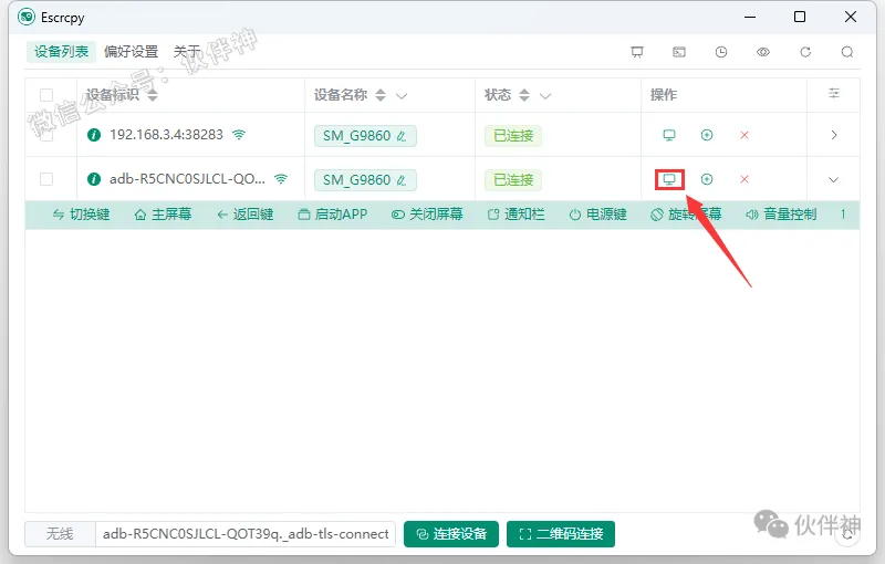4.配对成功后,会显示两个设备标识(可删带IP地址的标识),点击镜像即可操作手机。