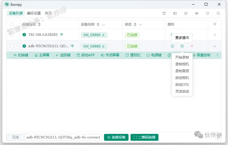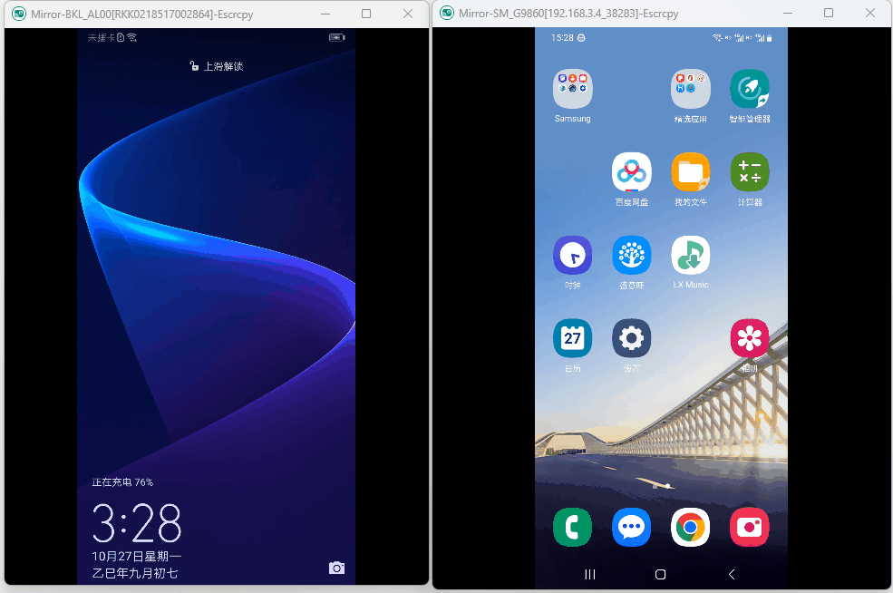 7.左边是通过数据线连接,右侧是通过局域网Wifi连接。在性能方面,Escrcpy 表现出色,能够以 30 到 120 帧每秒的流畅度显示设备屏幕,支持高达 1920×1080 或更高的分辨率,同时保持低至 35 到 70 毫秒的延迟,确保操作的即时性。