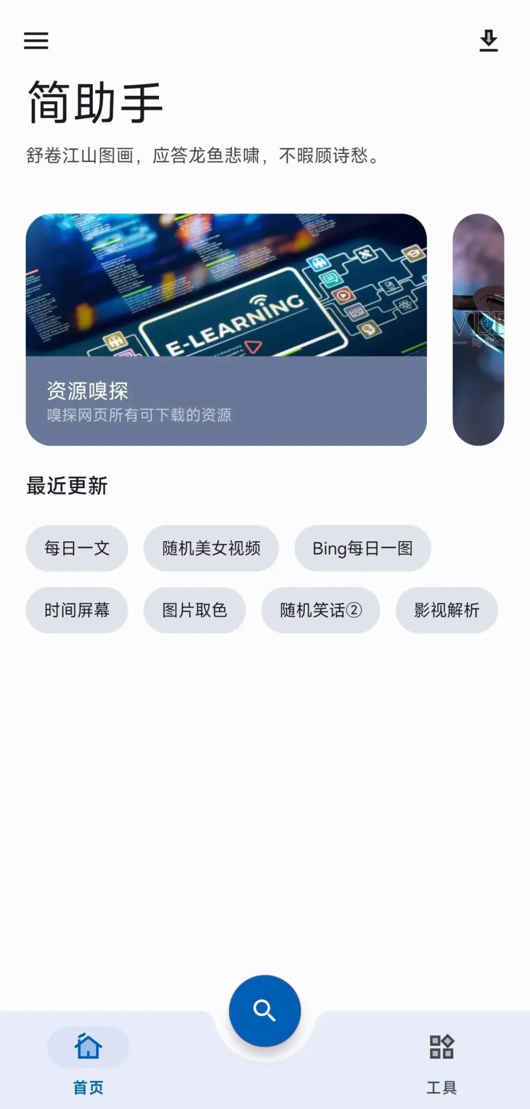 第四个APP叫简助手,原名集装箱,也是一个工具型APP,不过它有点不一样,首页主打资源嗅探、音乐搜索、短视频解析、随机视频等功能