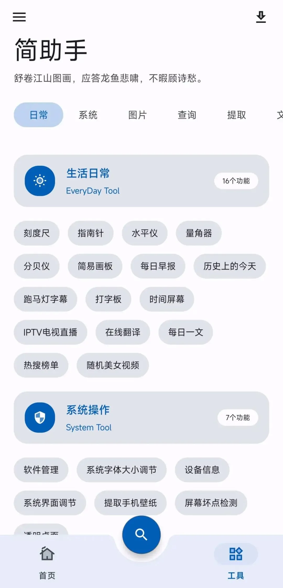 第二大界面则是工具页面,这里拥有日常、系统、图片、查询、提取、文字等众多功能
