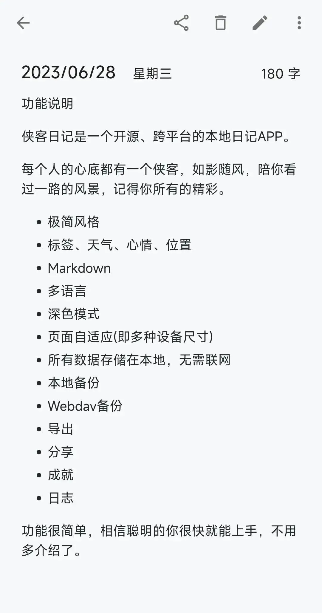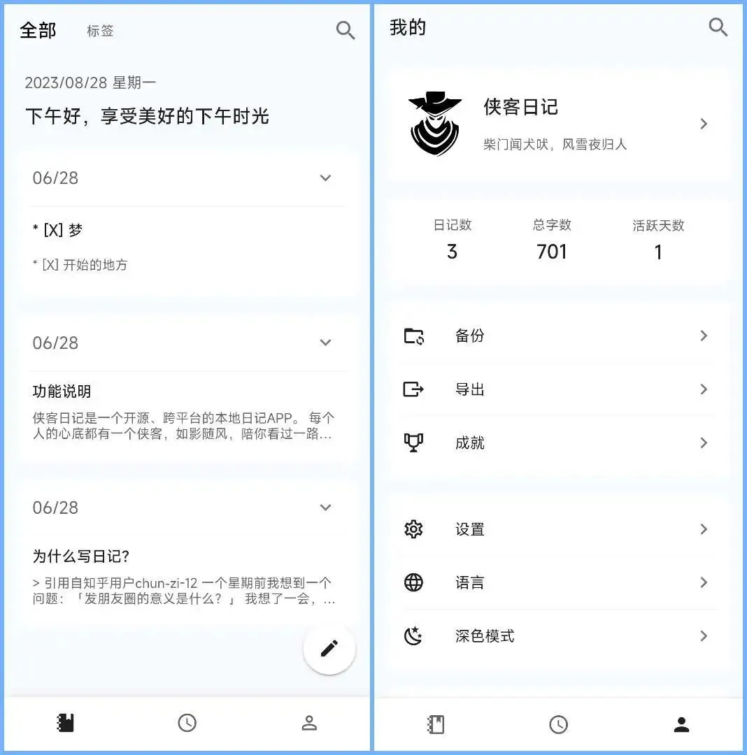 第六个APP推荐一个叫侠客日记的软件,这是一个开源的、跨平台的本地日记APP,这样的软件其实不多