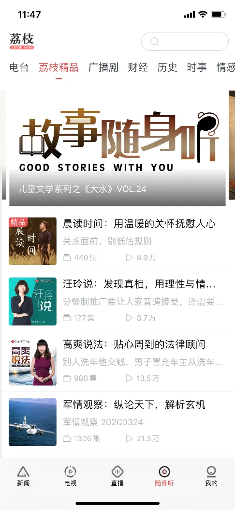 拥有其他新闻软件没有的随身听、直播等功能,