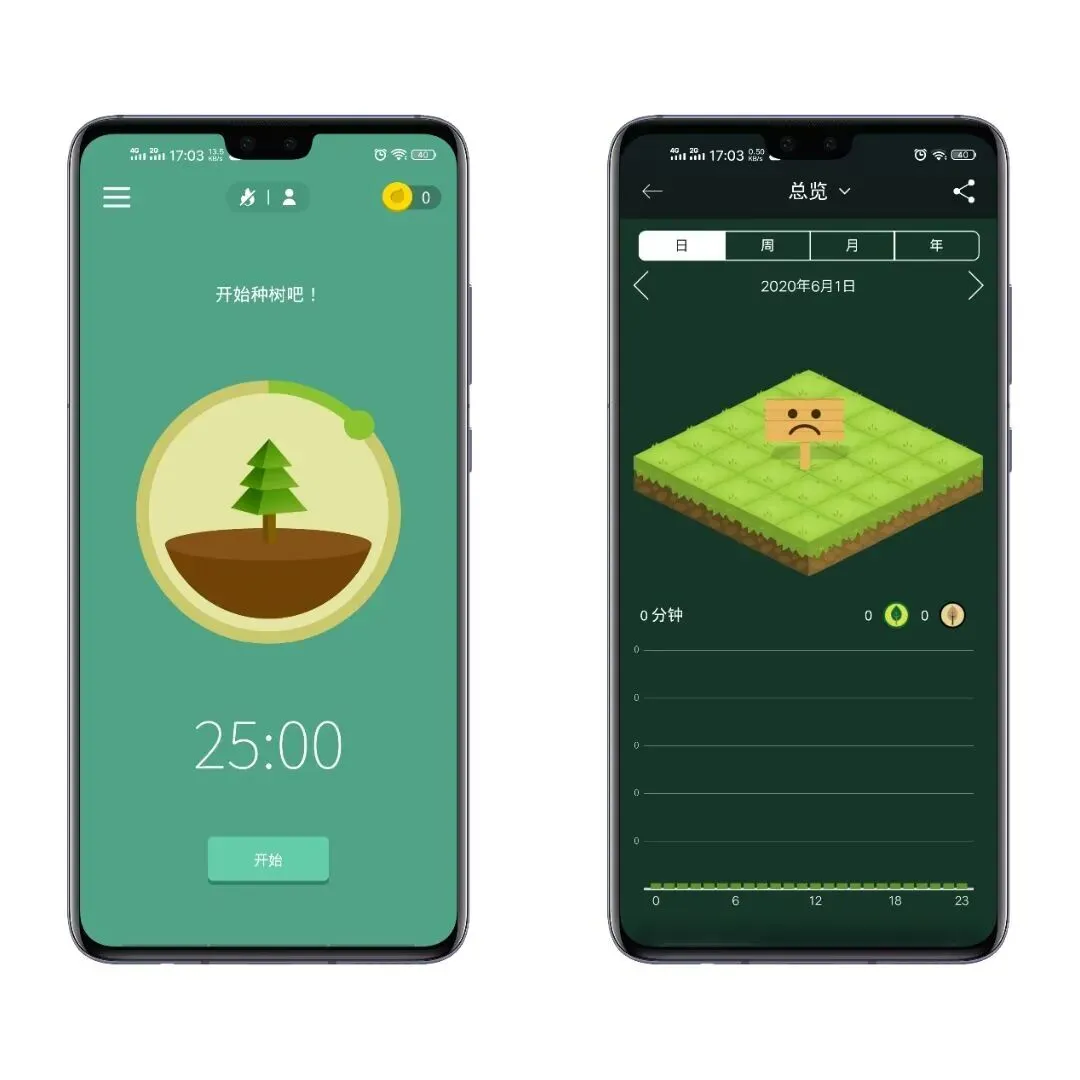 专注森林可以有效帮助我们提高工作效率,帮助我们养成好的习惯。这个界面是比较有意思的,我们设定一个时间,在这段时间里不能碰手机,小树苗就会长成大树,选择树种,种在自己的森林里。可以慢慢锻炼自己的专注力,慢慢戒掉自己的拖延症!