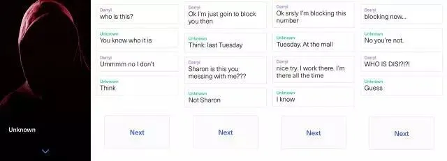 如果只是像普通对话一样,肯定不会有什么意思。Hooked应用中的每一条短信都是以人物之间的聊天进行的,所有的聊天内容都必须起到发展故事或者发展人物关系的作用。而每条信息最后都会留下一个悬念。