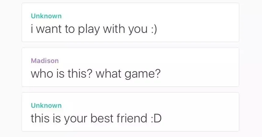 (“我想和你玩个游戏。”“你是谁?玩什么游戏?”“我是你最好的朋友,笑脸”)