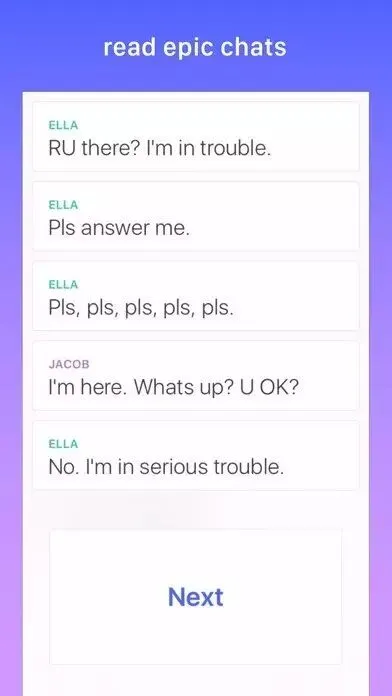虽然是一款小说阅读软件,却拥有着类似iMessage一样的短信阅读界面。Hooked 上的小说都是以小说主人公之间一问一答短信对话的形式向读者呈现短篇故事。它的界面没有采用模拟翻页的操作,读者只需轻触屏幕就可以看到下一条短信。