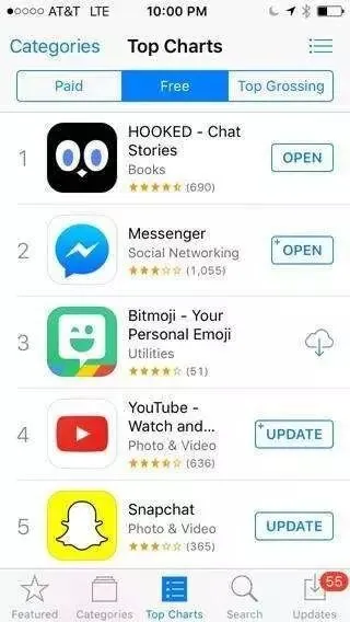 自2016年底上线以来,Hooked在短短半年多的时间里,就收获了1000万的用户青睐,在线阅读的小说信息超过了100亿条。在美国App Store排行榜上的排名甚至一度超过了Snapchat,跃居第一。