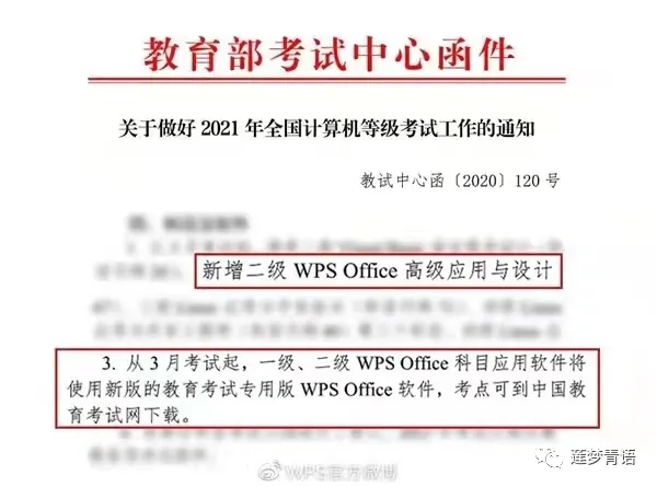 11月25号,国家教育部考试中心宣布:将新增计算机考试科目,正式把使用最广泛的国产办公软件——WPS Office作为全国计算机等级考试(NCRE)的二级考试科目之一,该项目调整计划于明年全国实施,3月正式开考。