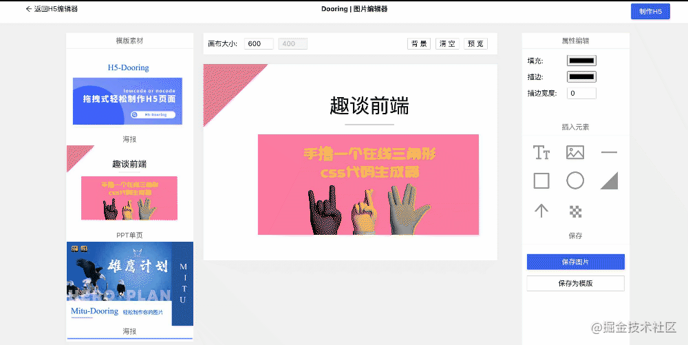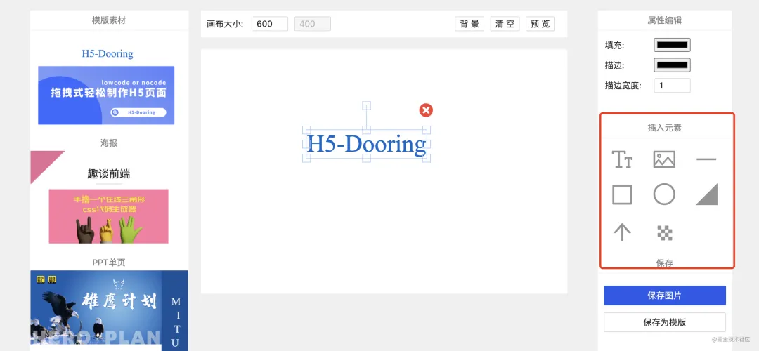 在设计图片编辑器的过程中我们也要考虑保存用户的资产,比如做的比较好的图片可以保存为模版,以便下次复用,所以我在编辑器里还实现的简单的模版保存和使用的功能。我们先看一下效果: