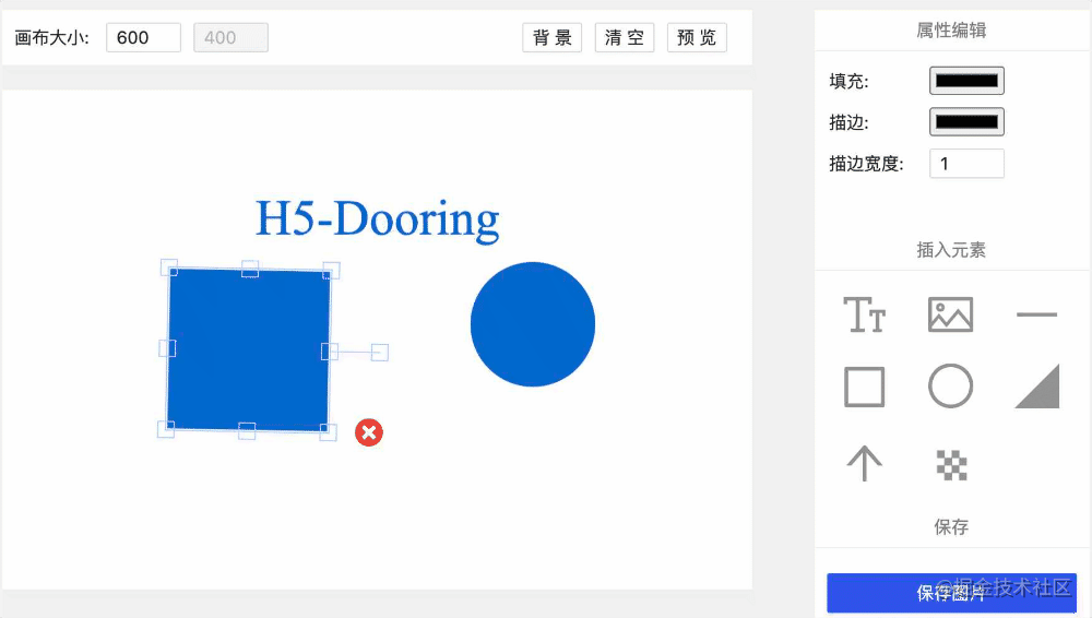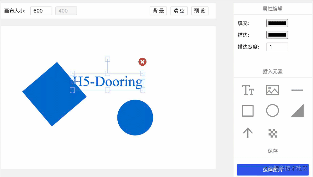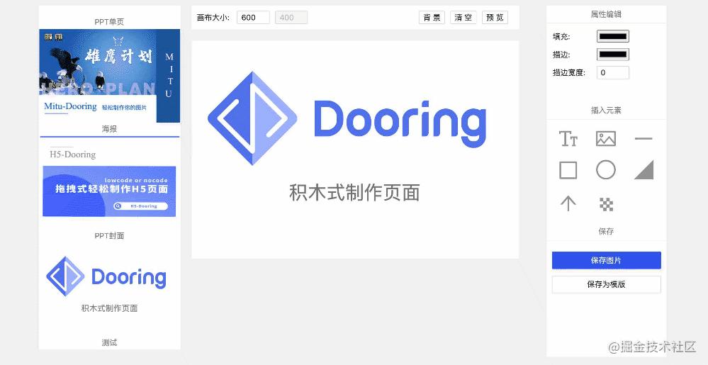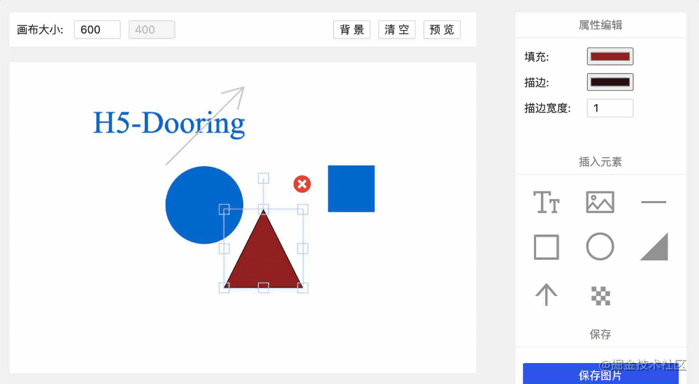属性编辑器主要是用来对图形属性进行配置的,比如填充颜色,描边颜色,描边宽度,目前我主要定义了这3个维度,大家也可以基于此继续扩展更多的可编辑属性,类似于 H5-Dooring 的组件属性配置面板。