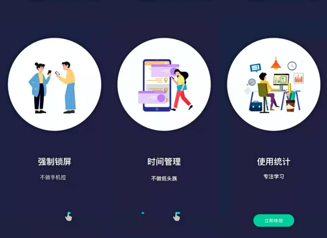 这款软件的非常简单大气,整个页面的背景是深蓝色的。功能性特别强:强制锁屏、时间管理、使用统计,专注于帮助小伙伴们控制使用手机时间,不愧是叫告别手机控!