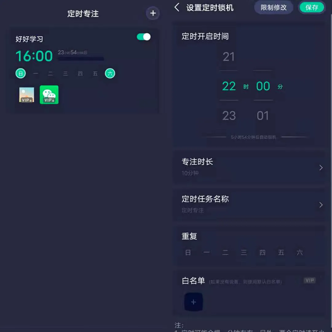 软件的第一大功能就是定时专注,就像是定闹钟一样。定时开启时间、专注时长、定时任务名称(多半是为了学习)。小伙伴们千万不要忘记自己的定时,手机锁的不知所然。