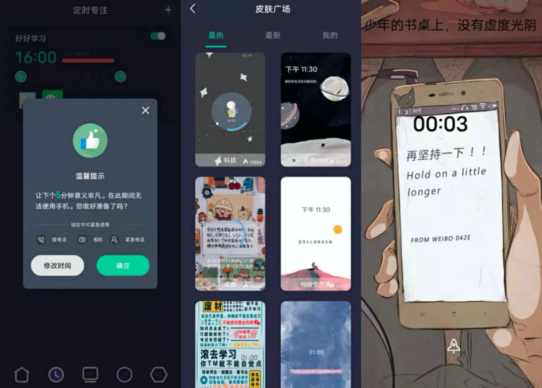在锁屏之前会跳出提醒,如果突然有事,可以修改时间,在皮肤广场还可以修改锁屏壁纸,比如我用的这款:再坚持一下!!少年的书桌上, 没有虚度光阴。很多风格,可以自己选择。省去了找励志壁纸的功夫。