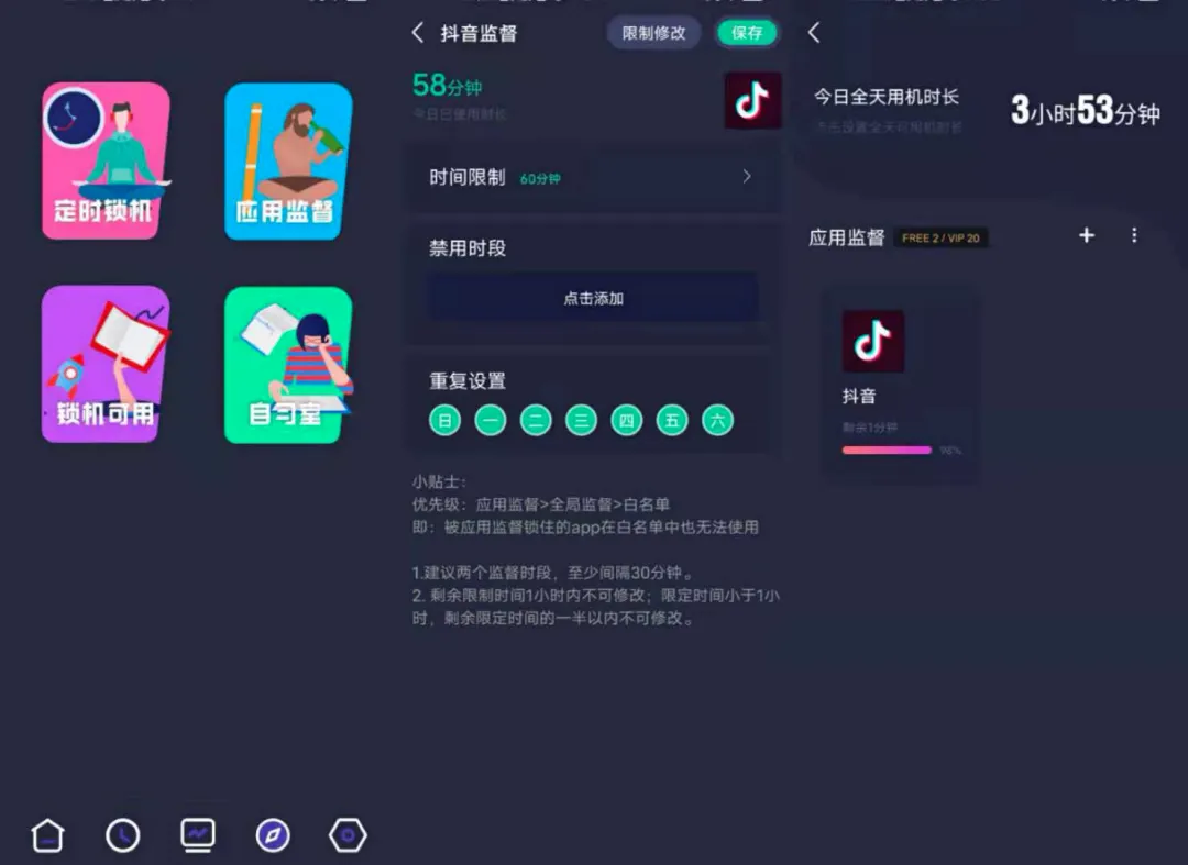 软件还有一个强大的功能:应用监督。这个功能就可以帮助一些小伙伴在避免删除软件的同时,控制自己的娱乐时间。比如在刷抖音的时候,它会在上方有小小的时间提醒。