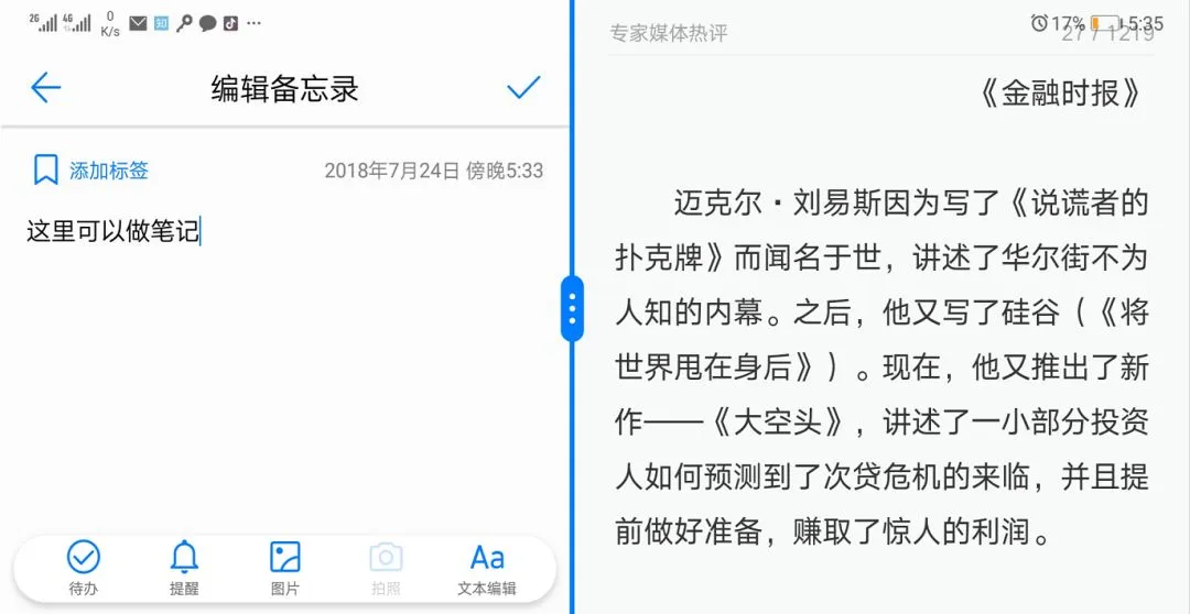你是否想过一边看电子书,一边记笔记。或者是屏幕上同时打开京东和淘宝,货比三家。现在安卓手机可以很轻松地做到这一点,至少可以实现左右或上下二分屏。