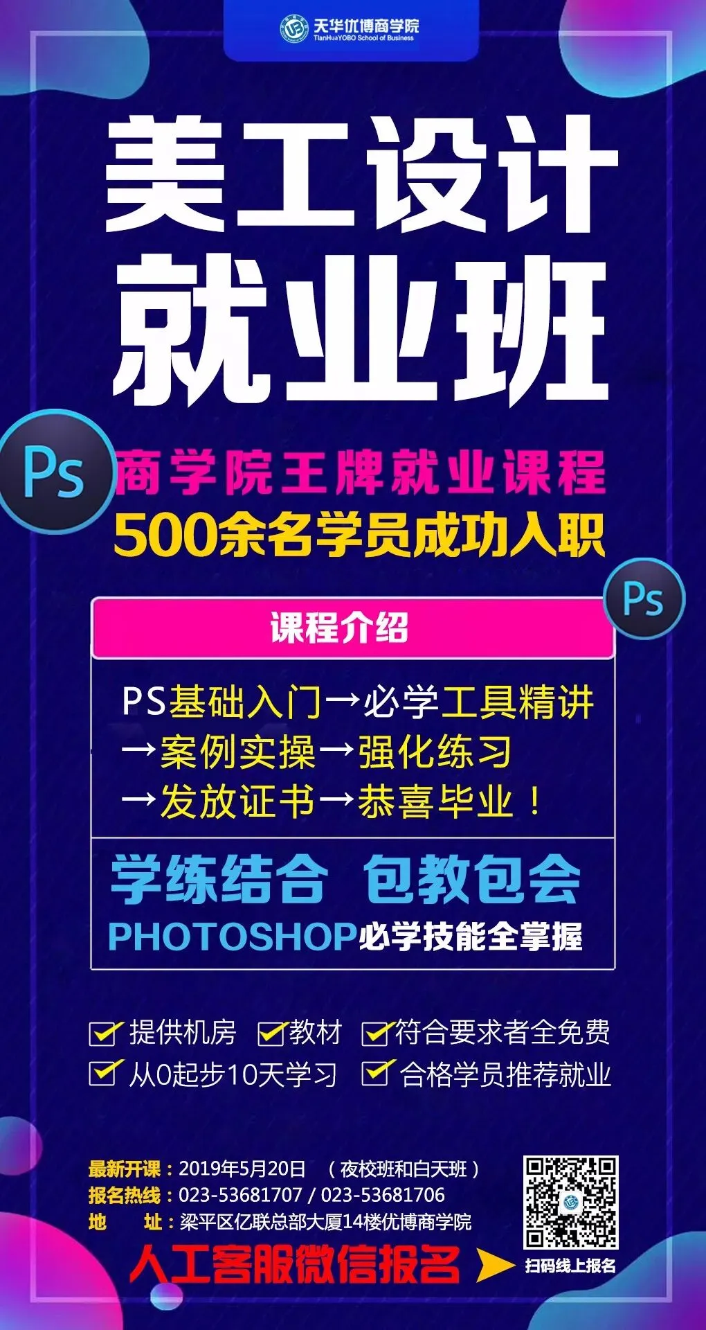 02、学后颁发职业技能电子商务证书,可无息贷款5-10万。以及PS设计证书。双证在手,就业涨薪无忧!