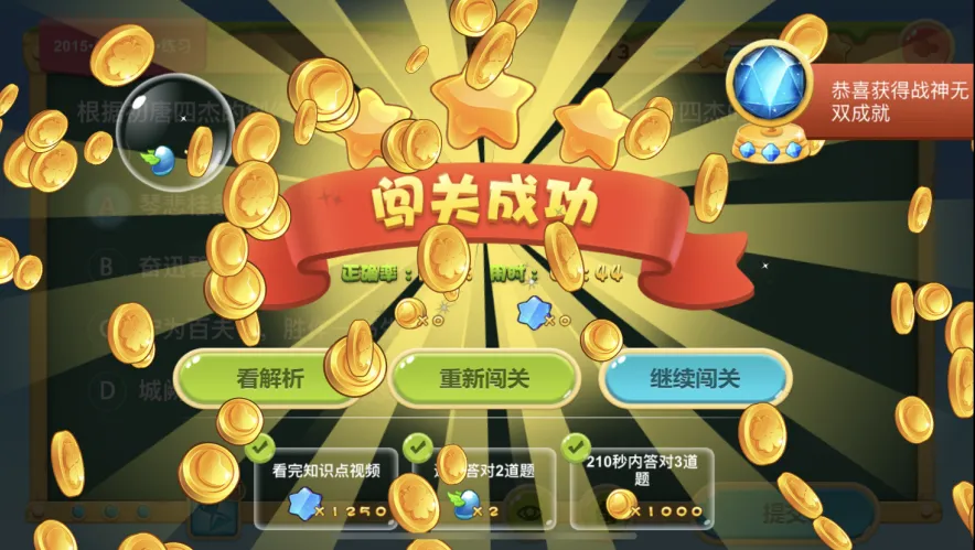 天天练设立了“答题闯关营金币、乐豆”、“排行榜”等环节,用这种激励机制增加孩子的成就感。