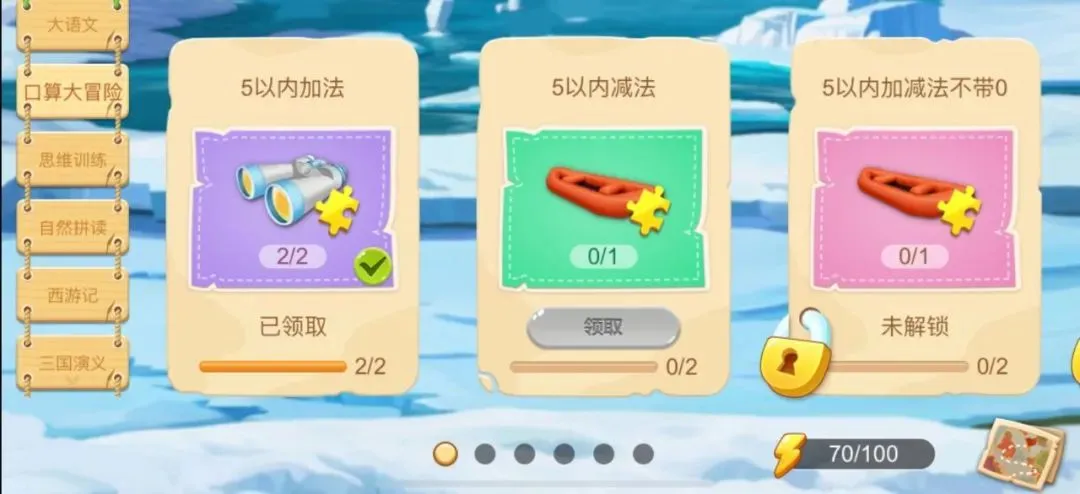 这部分,“天天练”采用游戏闯关的模式,让孩子通过做口算题,来解锁任务,做得越多、越准确,任务就完成的越多越好,可以解锁更多的任务,获得新的装备。