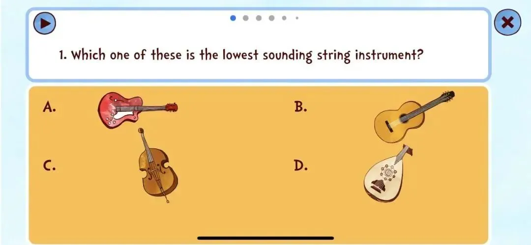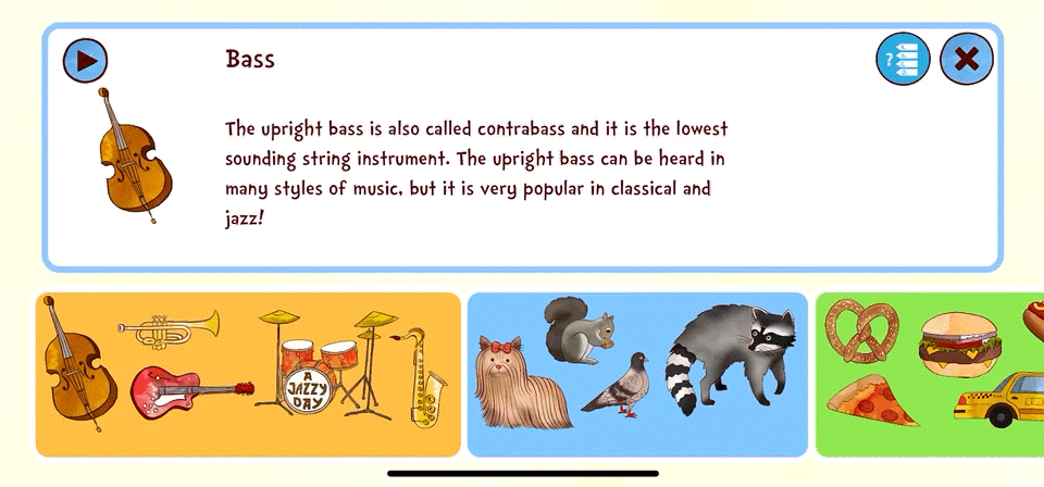 所有这些图片,点击就会出现一段简短的解释,有音频可以听。最关键的是,还有对应的声音可以听,比如乐器,就会出现乐器对应的声音。