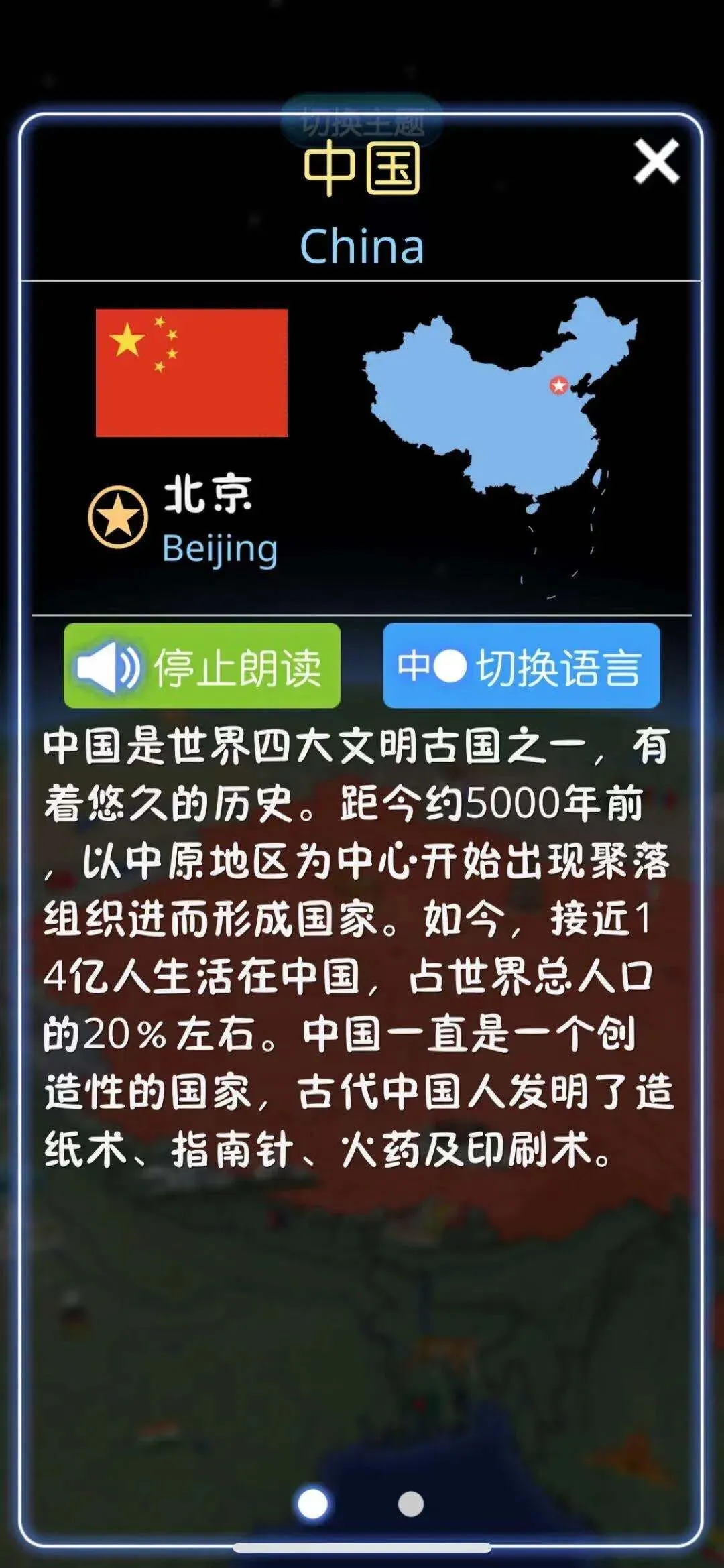 免费的部分,你可以点击各个国家,就会出现这个国家的国旗和简介。简介有中英两种版本,而且是带音频的。
