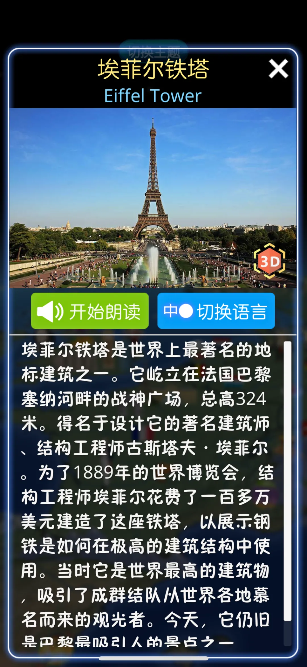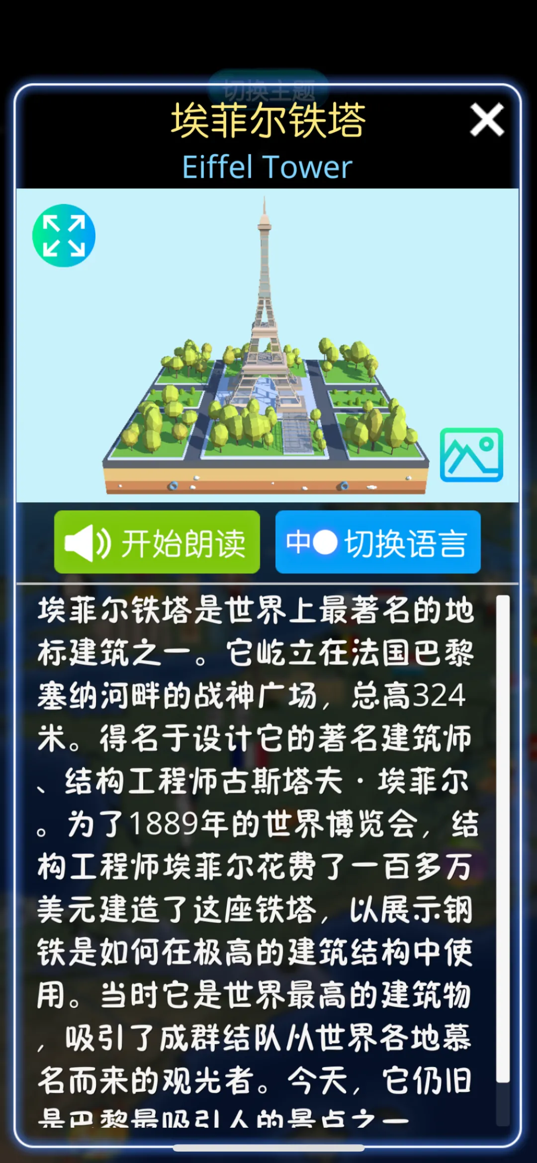 如果买了拓展包,地球上的人物啊,地标啊,动物啊就都可以点击开,同样是有中英两个版本的介绍,虽然文字并不长,但作为碎片知识,已经很足够了。