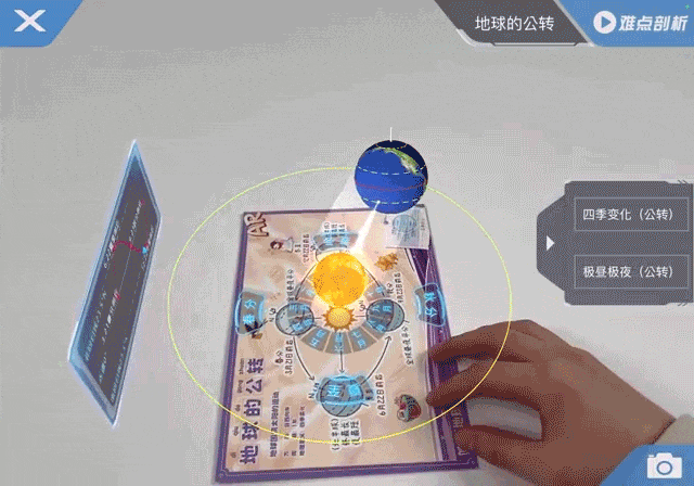 我正好最近给她讲解地球的公转和自转,这个光是靠我讲、看书里的图片,并不好理解,但是如果我搭配下面这个地球的公转和自转的AR画面,就容易理解太多太多。