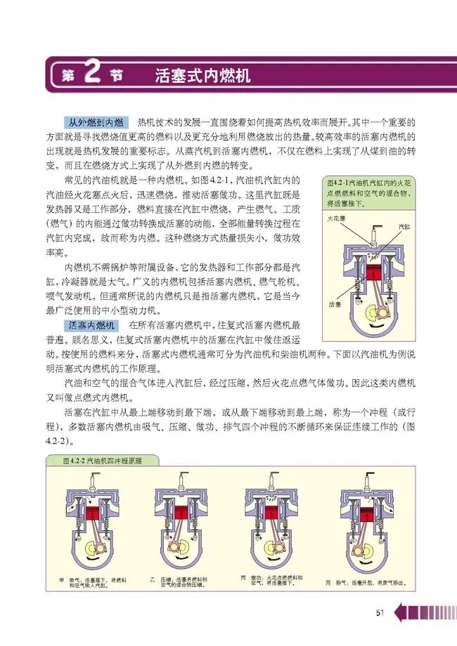 教材里就几段文字,讲了内燃机的工作原理,是活塞式的运动。
