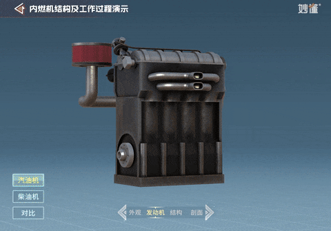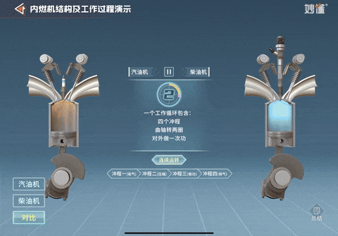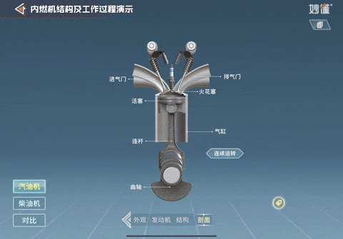可是究竟内燃机是怎么工作的呢?活塞运动究竟是怎样的呢?书里讲不清,可是我们在妙懂的APP里找到了更详细的解释。