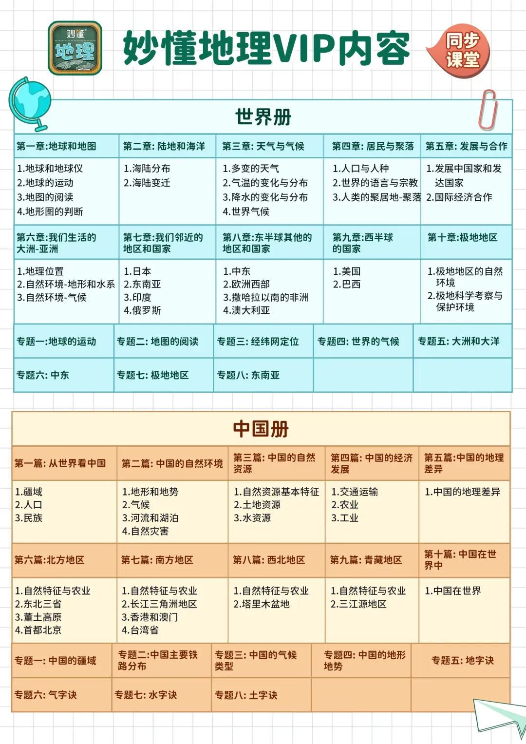 下面这个是“妙懂地理”和教材同步的内容大纲。
