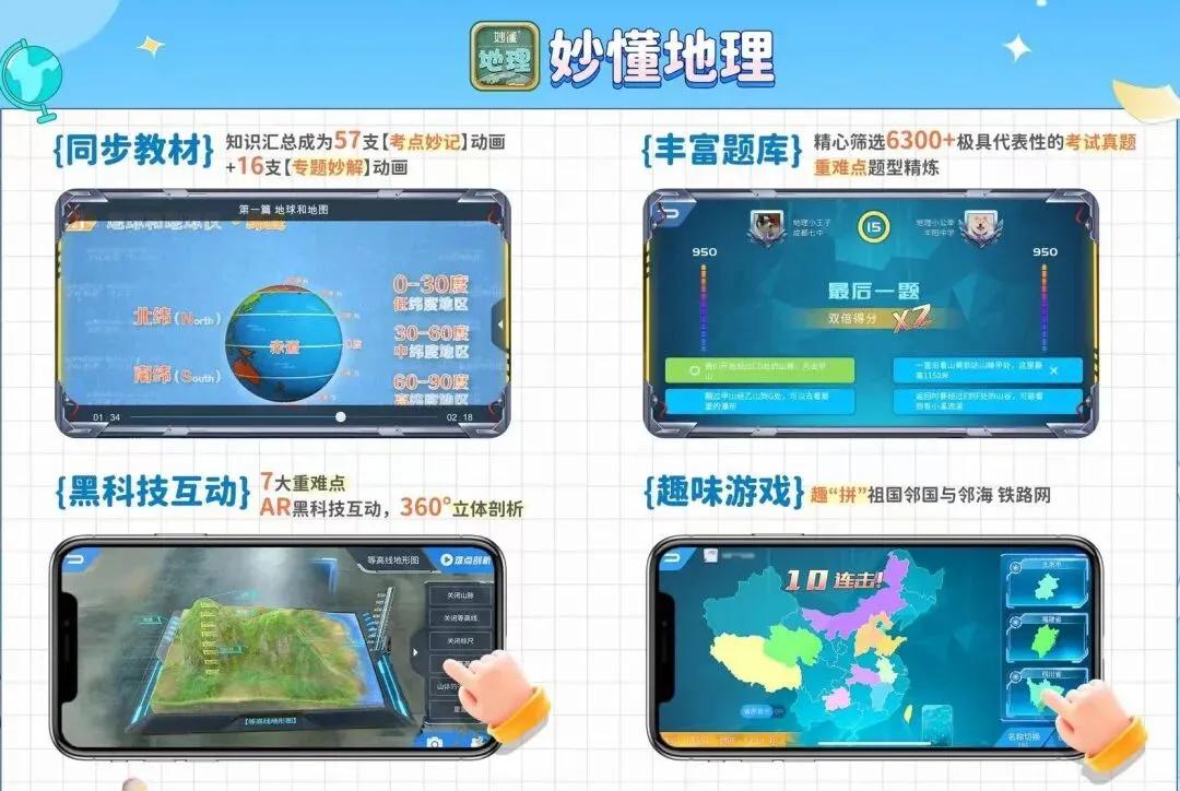 总共57个考点妙记动画+16个专题妙解动画,6300+考试真题重难点的题型精炼,针对地理的7大重难点有AR黑科技互动、竞赛和游戏等环节。