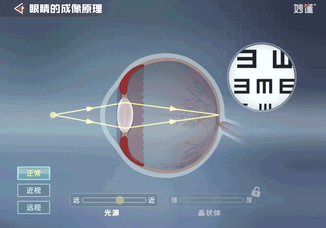 下面是在演示眼睛的成像原理,通过近视和远视的动态变化,我们就能知道近视镜是凹透镜还是凸透镜了。