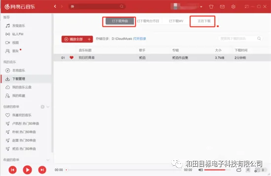 2、下载完成之后,点击左侧栏中的“下载管理”,可以在列表中看到自己下载完成和正在下载中的歌曲;