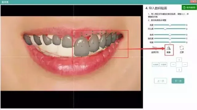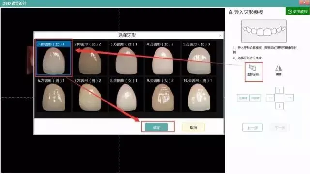 选定牙形模板和数码贴面后,系统自动替换到所有牙齿上面,无需一一更换。将一侧的牙形调整好之后,依然可以直接镜像到另一侧快速完成。