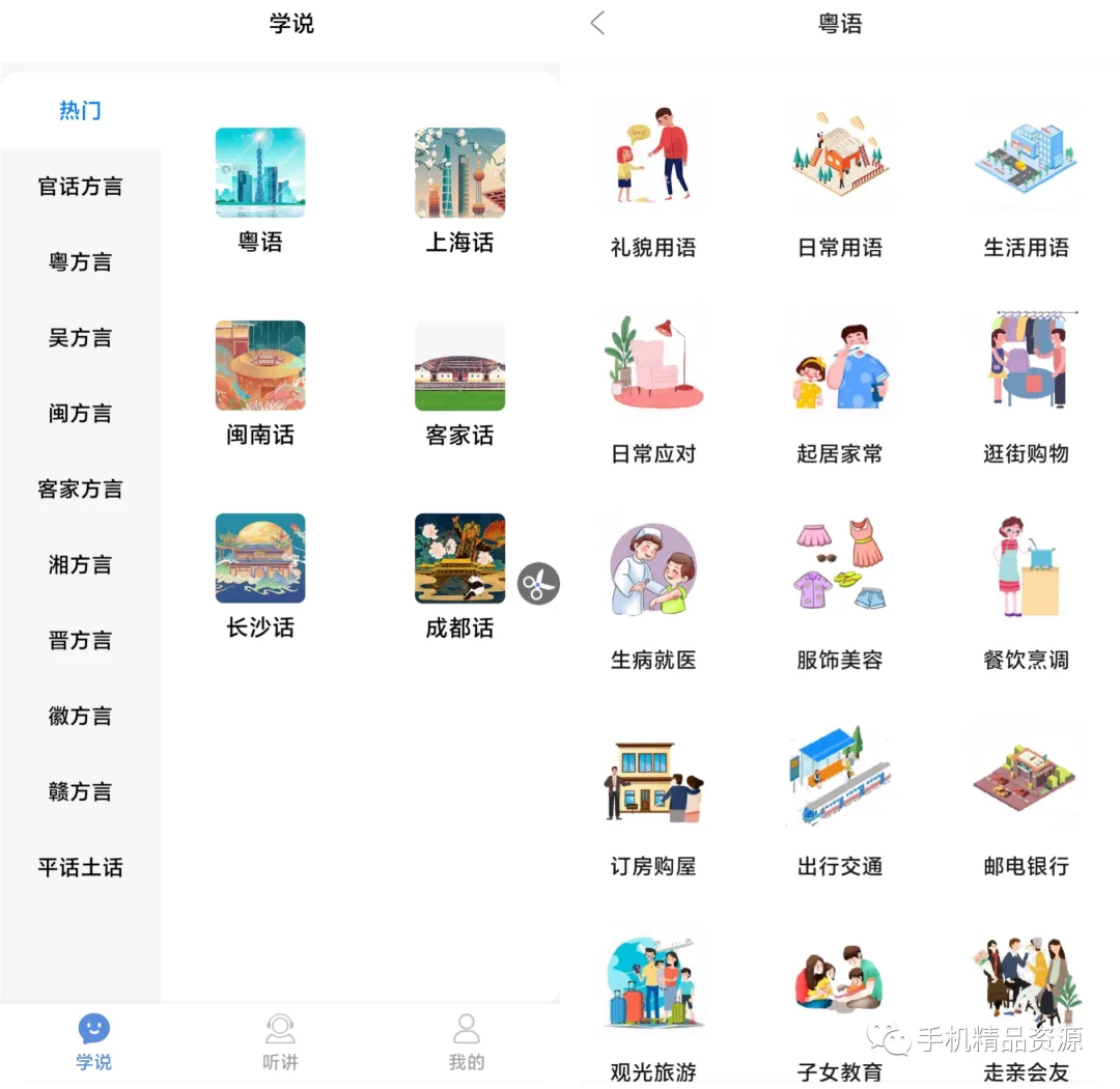 软件安装后打开就是方言分类,没有広告,而且超多方言应有尽有。有不同场景的常用话语,有礼貌用语、日常用语、生活用语、逛街购物、生病就医等等这些都很有用处,点开你需要学习的场景就可以开始学习了,点击语句,就可以播放,让你快速理解意思和跟读,还有录音对比。