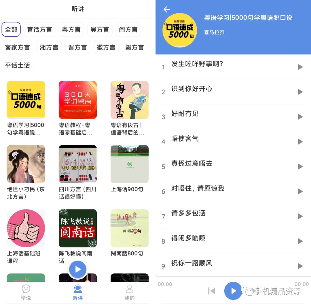 接下来分享一款可以学习全国各地区方言的软件:方言通,本软件是一款非常有意思的方言学习软件。这里有全国各地的方言分类,你想学什么方言,直接点开你需要学习的场景就可以开始学习,点击语句,就可以播放,让你快速学会各地方言!