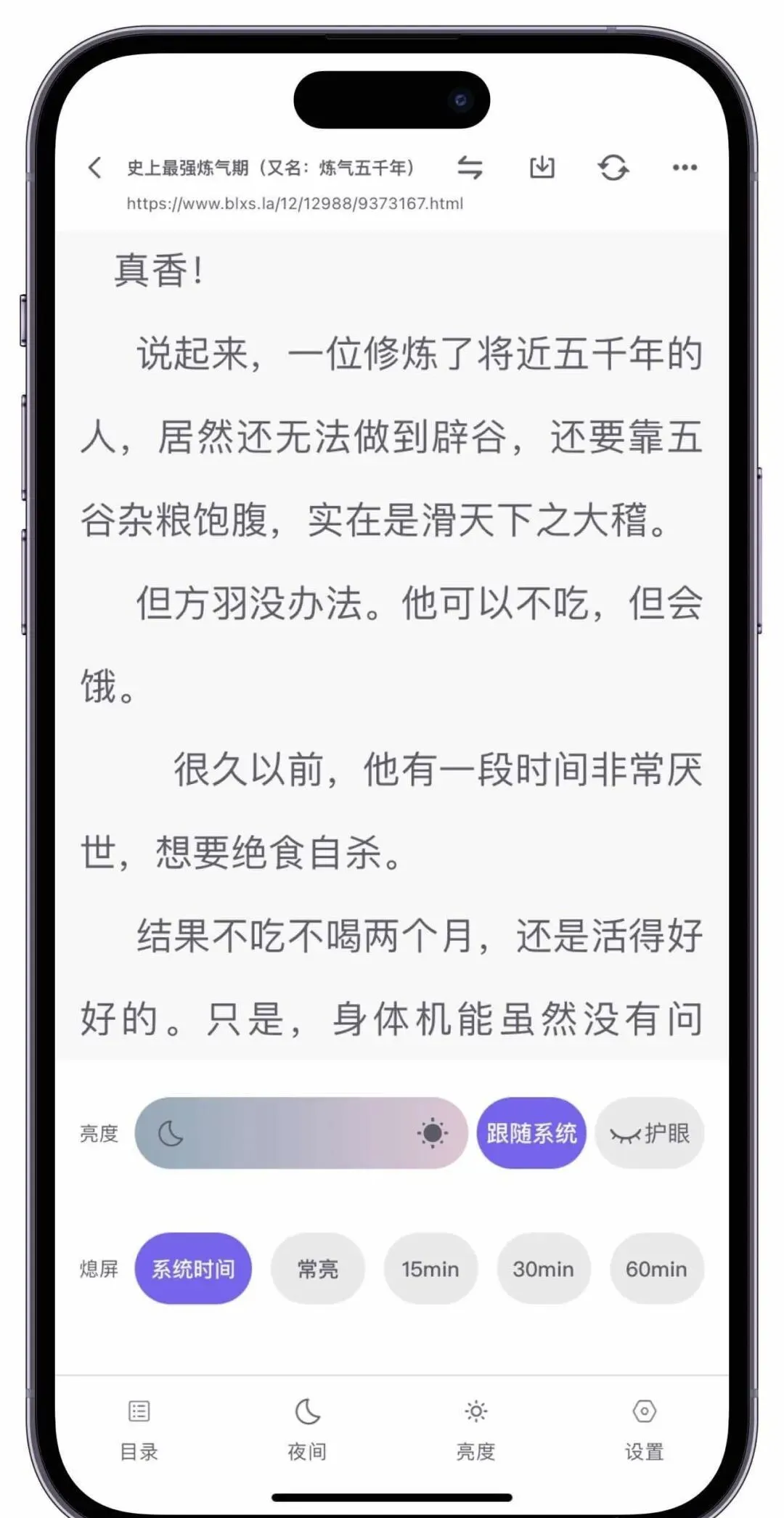 阅读界面非常简洁清爽,而且还提供了一系列的基本功能设置,包括亮度调节、字体大小、字体间距、背景颜色、翻页方式、护眼模式、熄屏时间设置等。