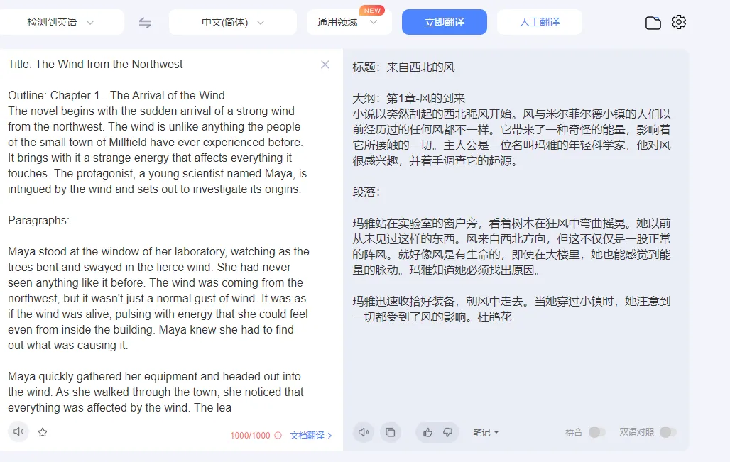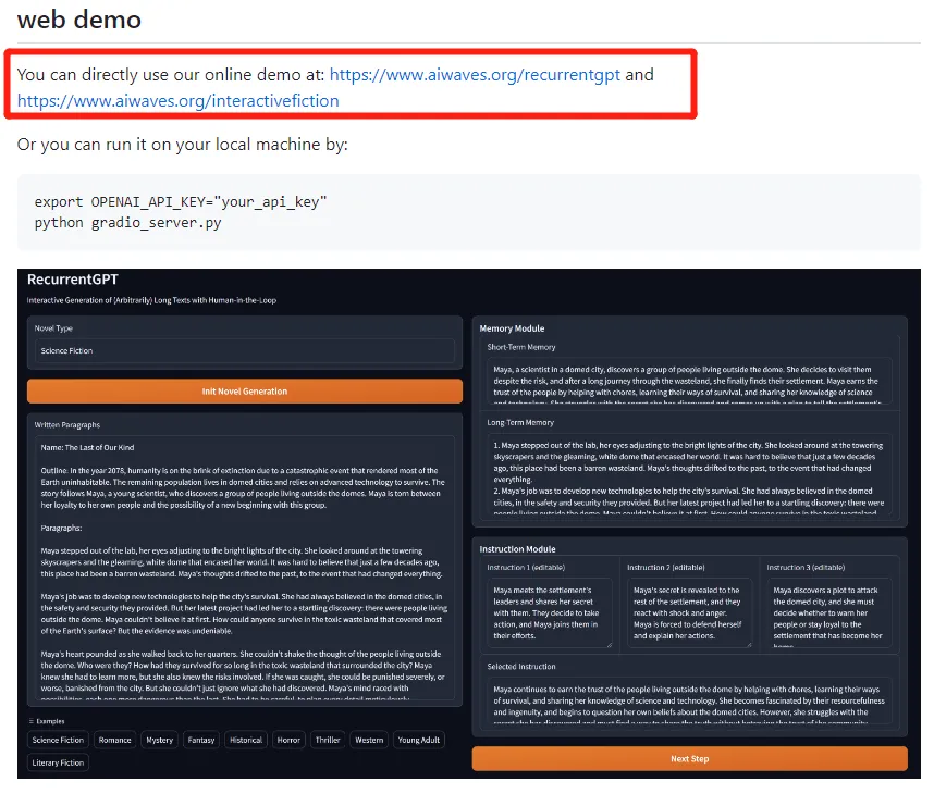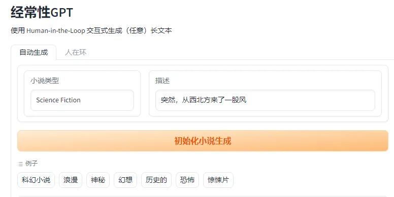 项目提供了科幻、神秘、幻想、历史等实例,点击即可设置小说类型,然后在右侧的描述部分输入自己描述的内容,点击初始化小说生成,就能自动生成小说。