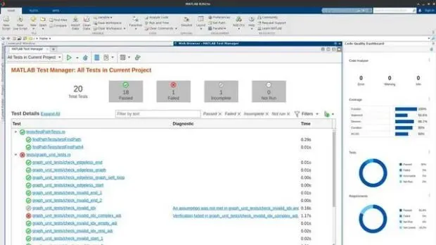 MATLAB Test™提供了开发、执行、测量和管理MATLAB®代码动态测试的工具,包括已部署的应用程序和用户自编的工具箱。您可以使用基于项目的质量仪表板,将代码准备情况的可见性提高到一个直观的摘要水平。该仪表板是一个交互式的、图形化的代码质量指标摘要,可点击代码分析、代码覆盖率、测试结果和需求的细节。