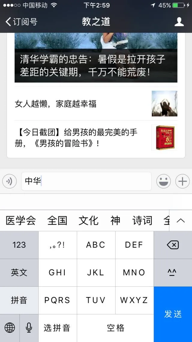 第二步:把关注的公众号当做好友发消息,在对话框回复 “中华”进入领取流程!