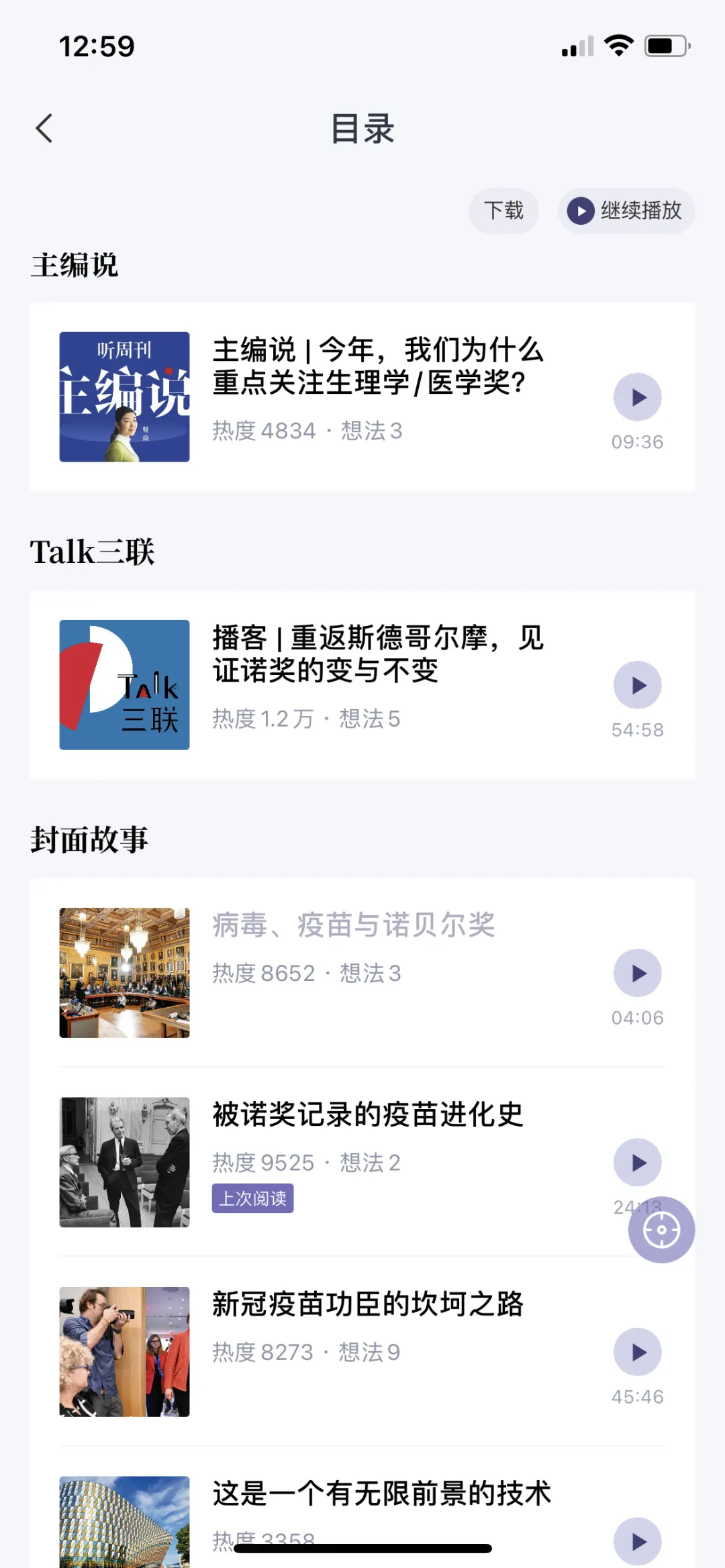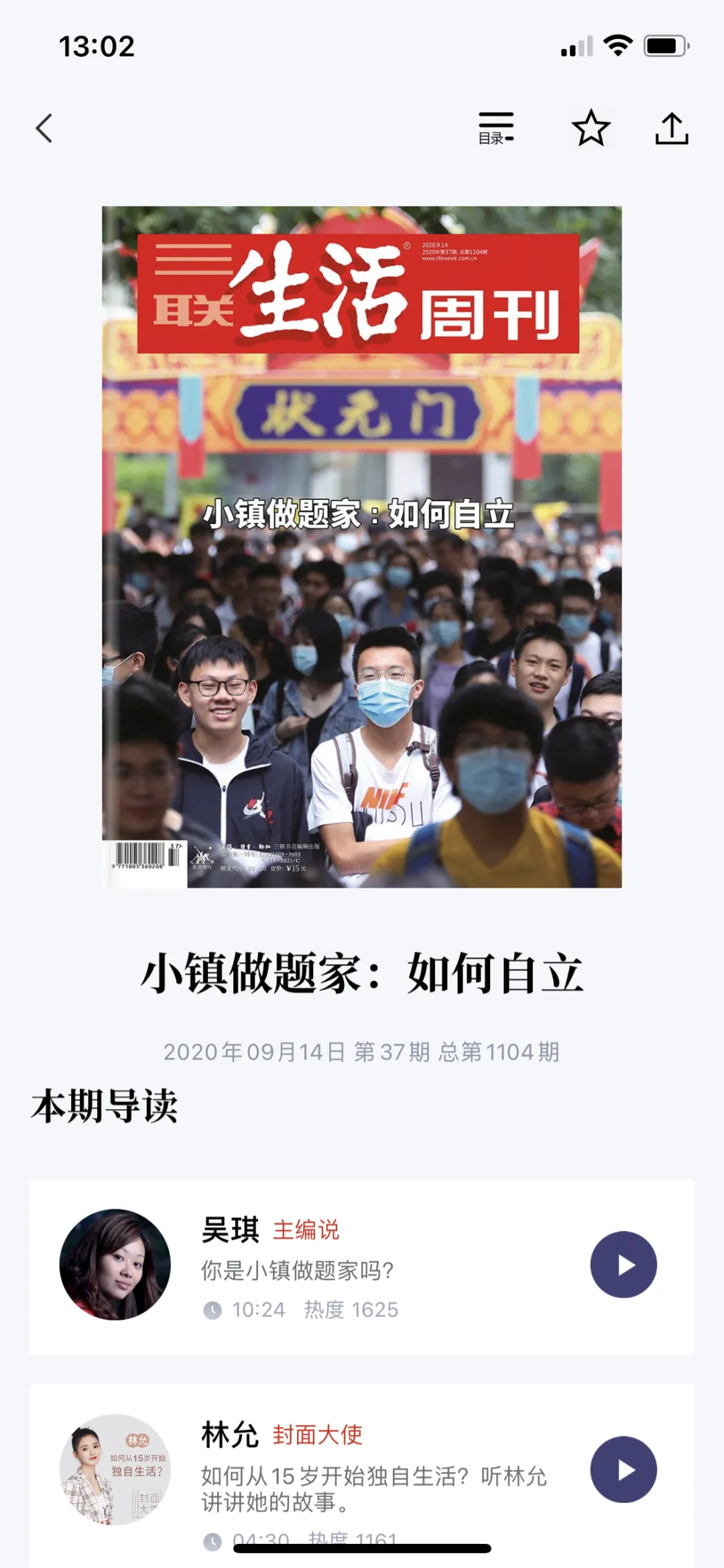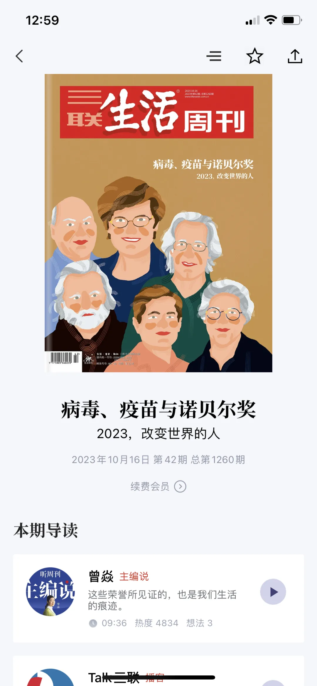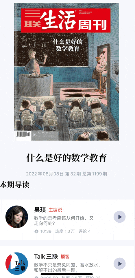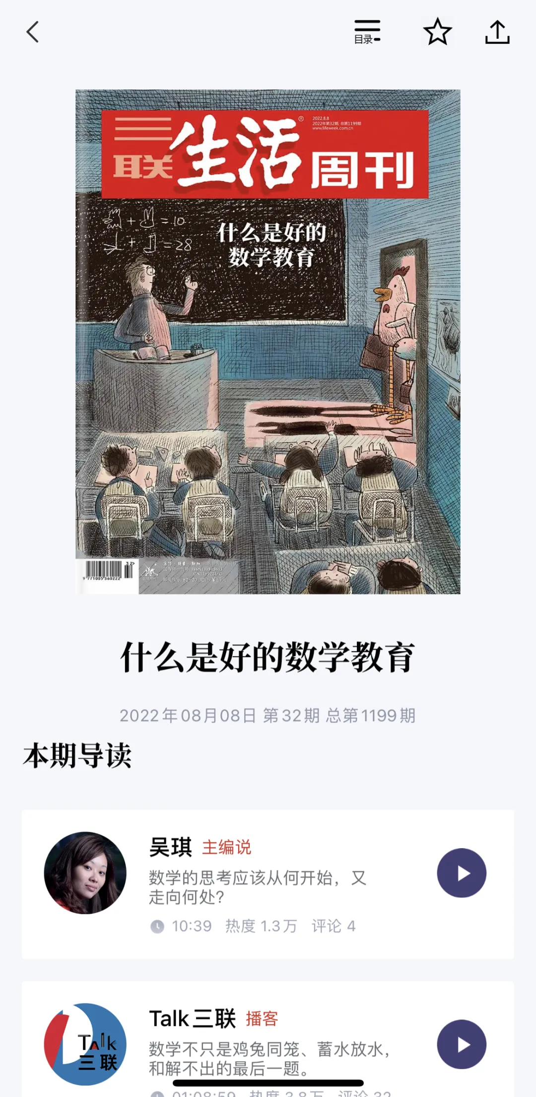数字刊课不仅是纸稿简单的的朗读版,而且能听到数字刊专享的「主编说」导读,和「Talk三联」播客,这两个栏目都是对于封面故事的深挖,像聊天,但输出了满满的信息量和干货,好栏目。