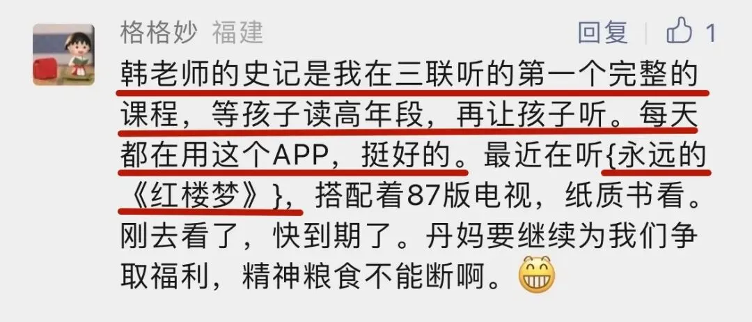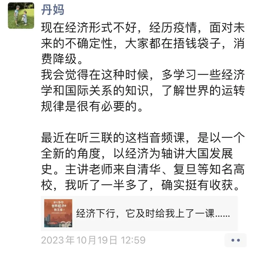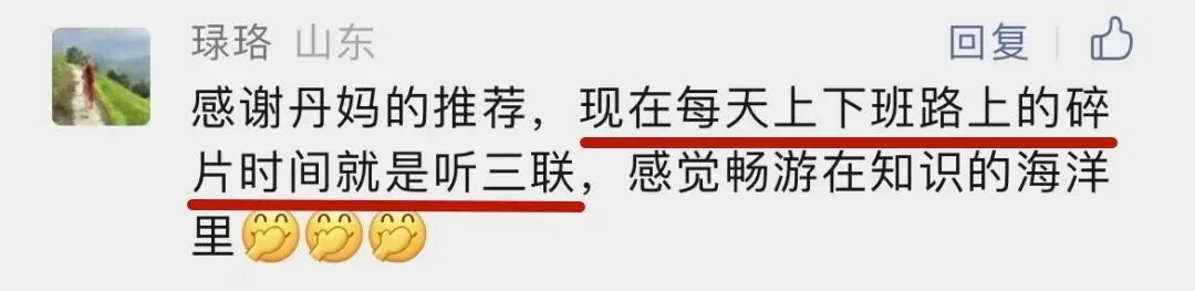 而接娃路上、睡前、工作间隙时,我也能愉快地听三联的音频课,碎片时间也能充满新鲜感。