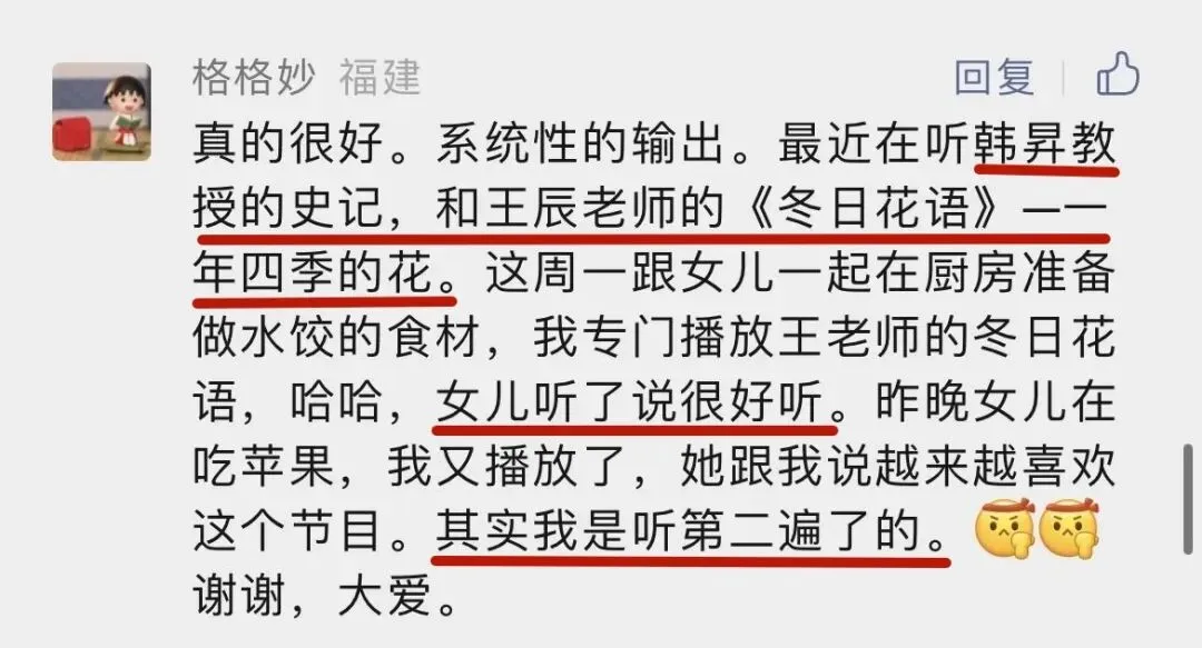 它们都是对我们传统文化的深度、全面的展示,所以全家老小都能聚在一起听,浸润在知识的海洋里,也让我和娃有了更多交流的谈资。