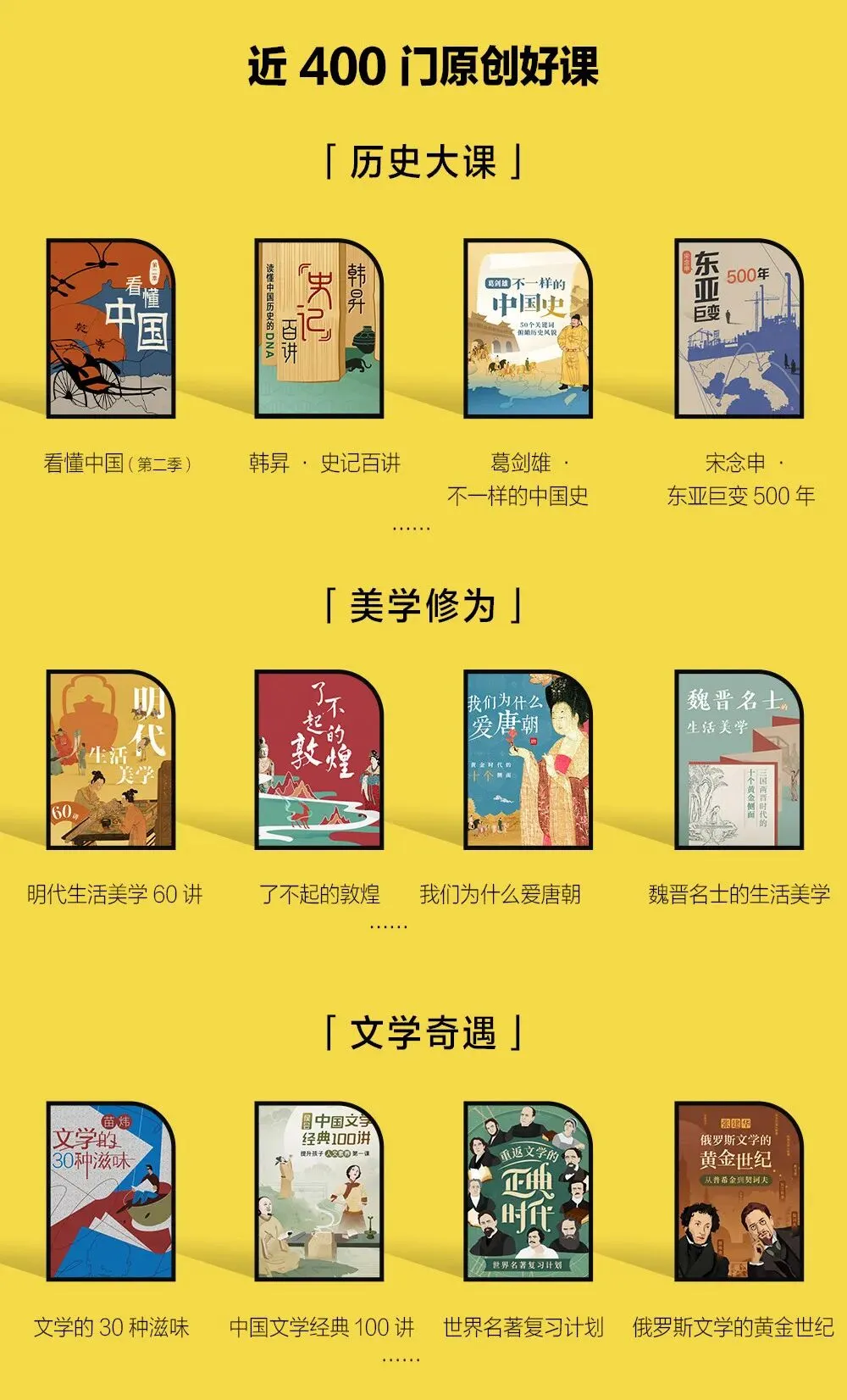 仅仅在历史文博以及文学板块,就有足足200多套课程,十分丰富。