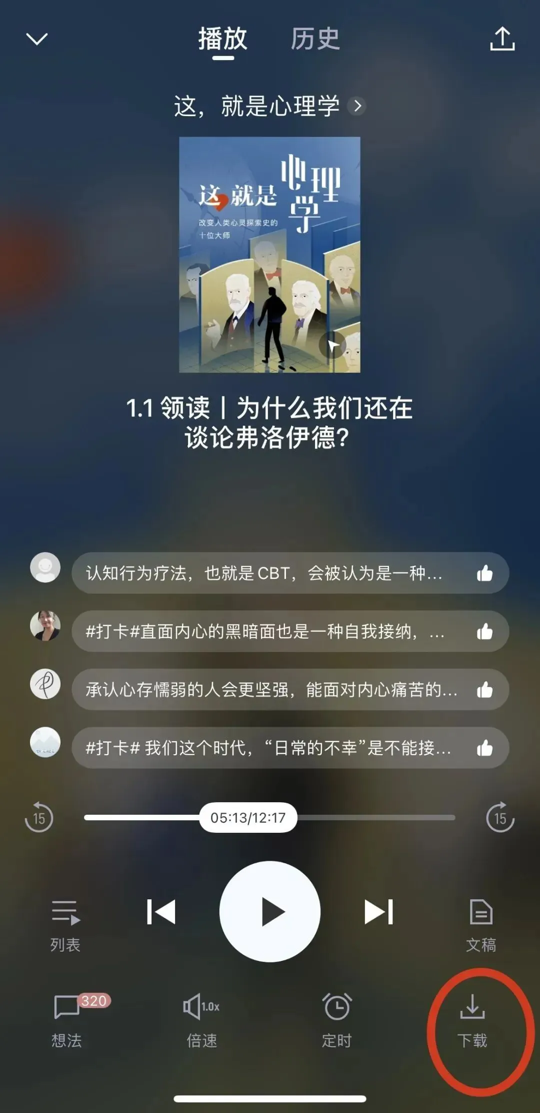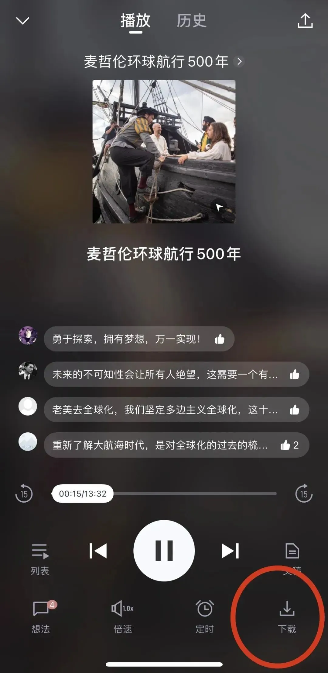 点击播放界面的右下角“下载”,完成后就可以在“我的-已下载”离线收听了。