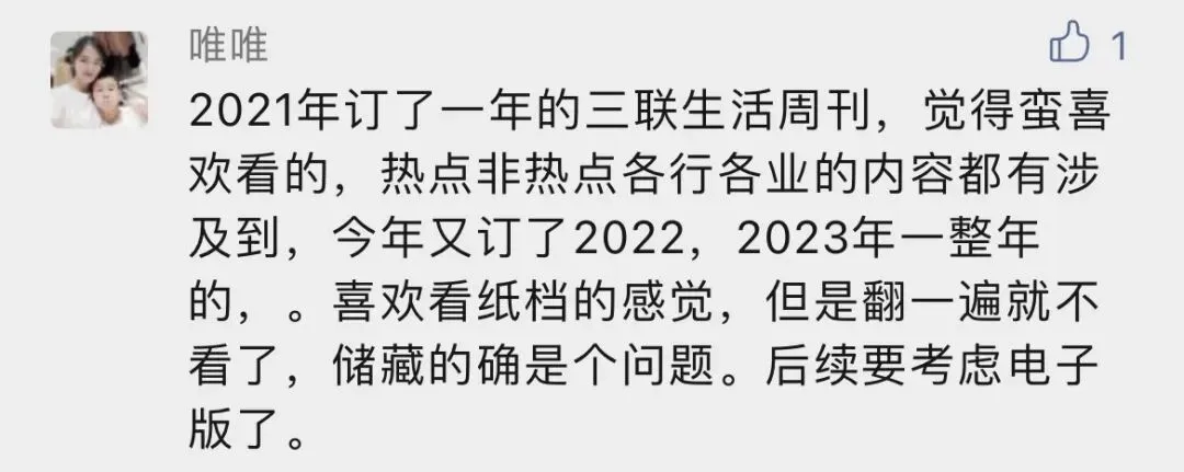 作为一个老读者,见证了三联从纸刊到数字化一路的探索,订纸刊、读三联的公号,到现在有底气地推荐中读App,我是真心为三联一如既往“在线”的品质感到骄傲。