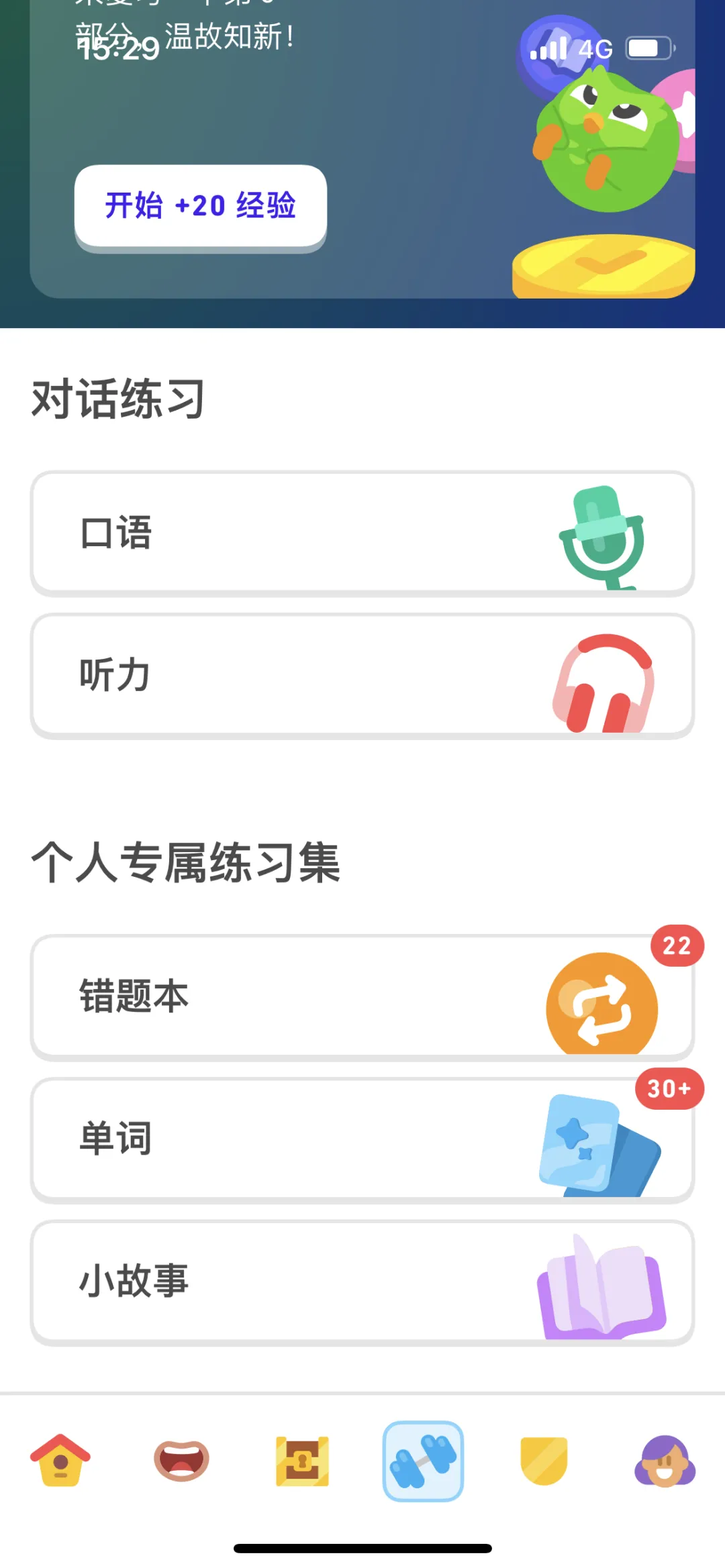 像玩游戏一样可以通关,获得奖励。听、说、读、写都包含。