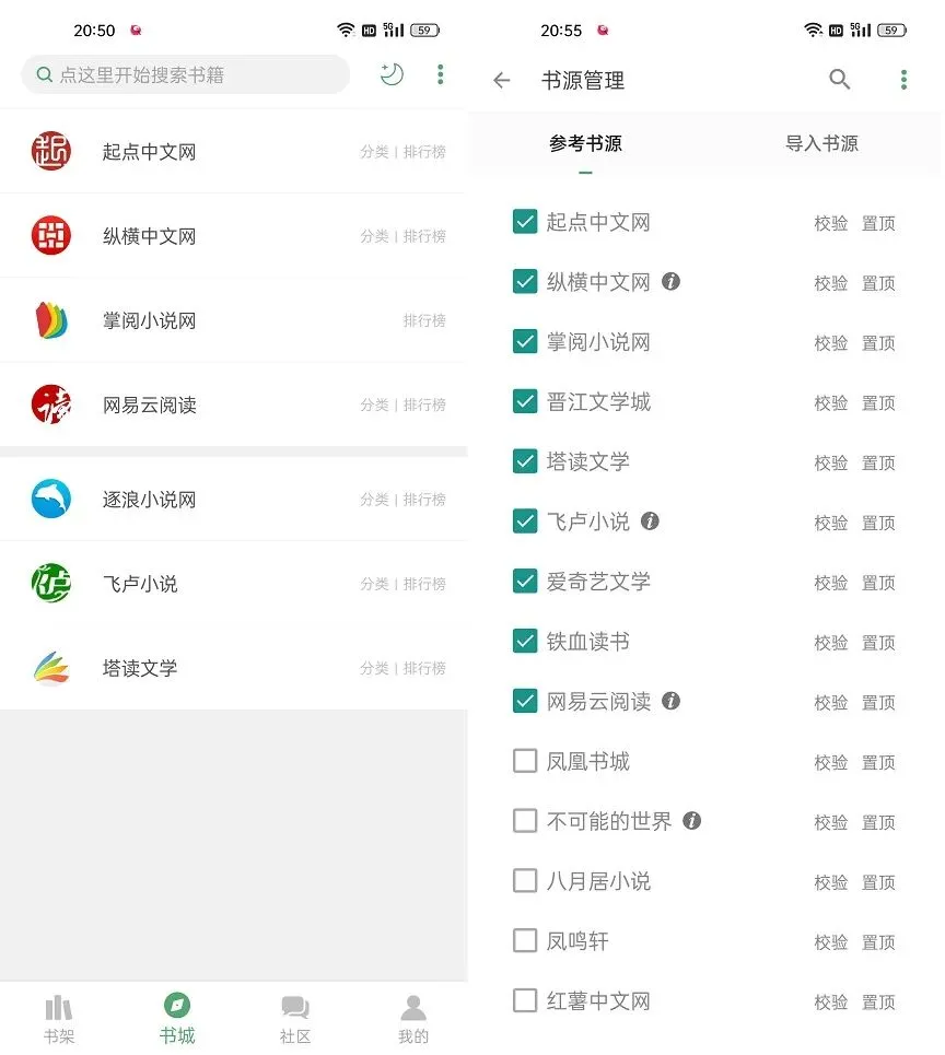 2、搜书大师简洁版解除了书源屏蔽限制,除了可以在底部的「书城」里找到知名小说平台书源外,还可以在书源管理总,任意导入第三方书源,看全网小说非常方便,如图所示。